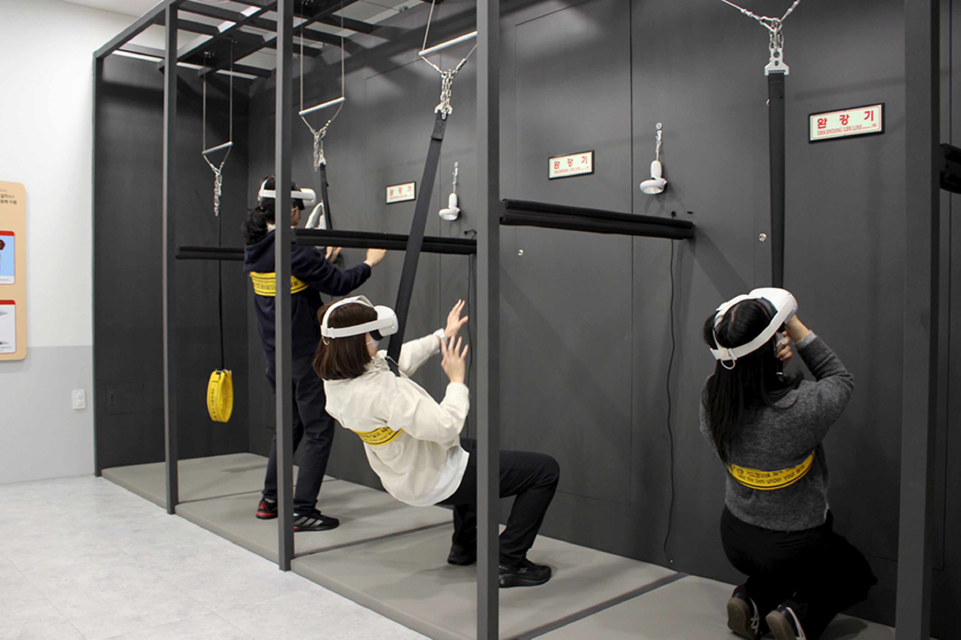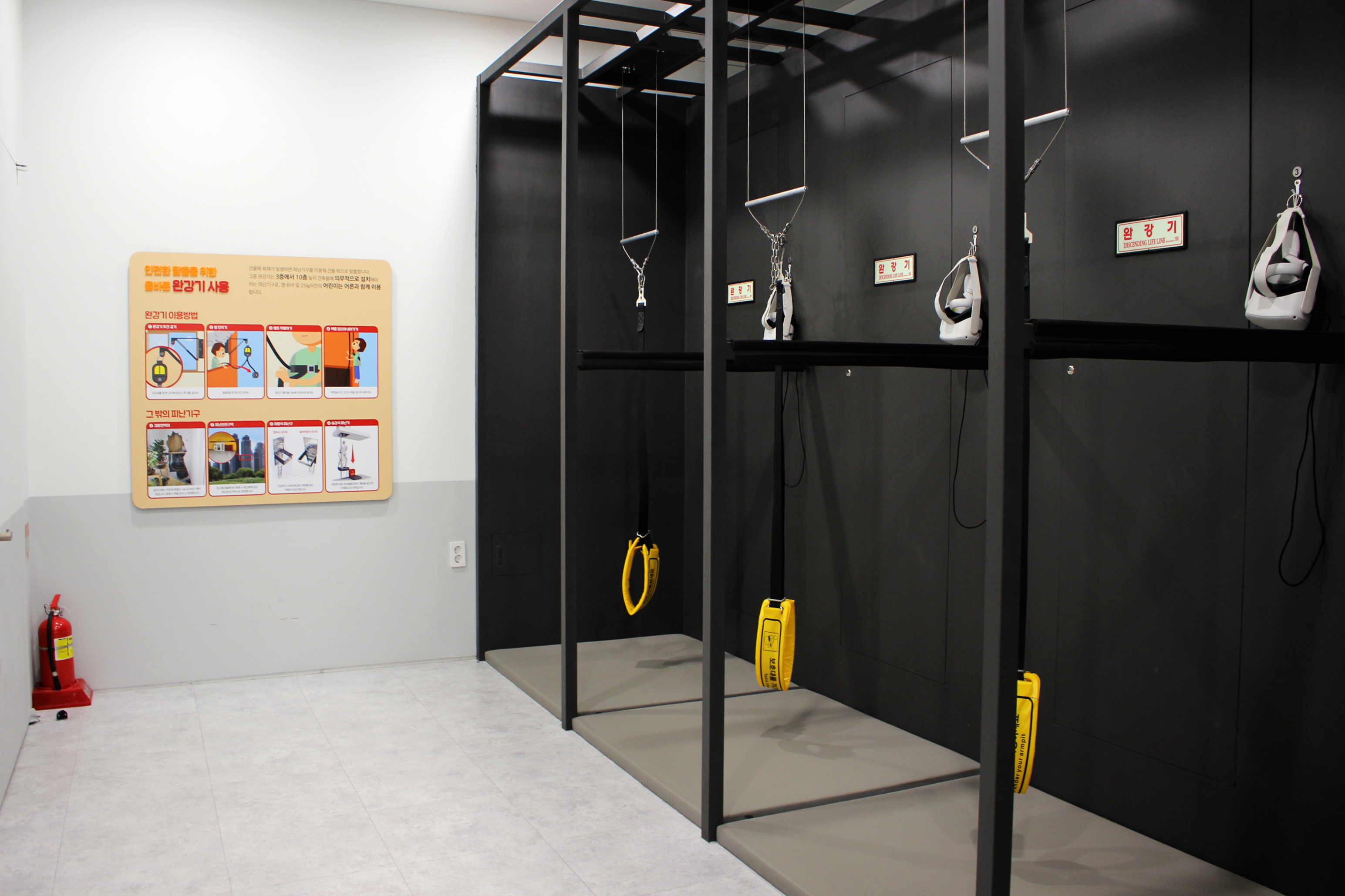 실제 완강기를 착용하고 가상현실(VR)에서 안전한 탈출 요령과 완강기 사용 방법을 배울 수 있습니다.